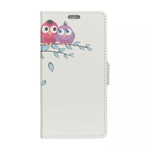 • Die Außenseite des Bücherregals ist weiß und auf der Vorderseite befinden sich 2 süße Eulen, die gemütlich nebeneinander auf einem Ast sitzen.